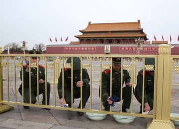 北京迎全國兩會數百武警洗天安門護欄