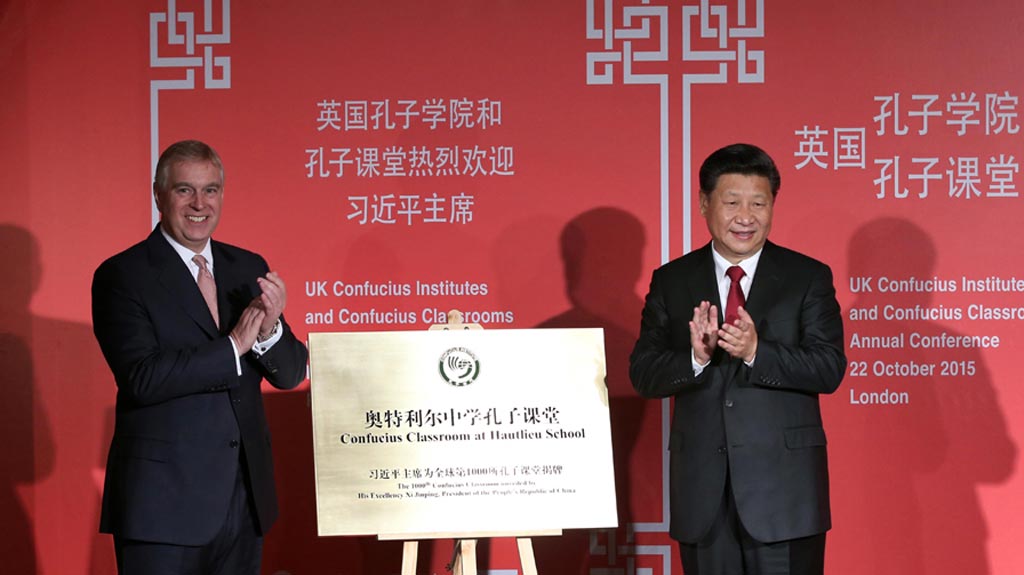 這是習近平和約克公爵安德魯王子共同為全球第1000所孔子課堂——奧特利爾中學孔子課堂揭牌。”圖為:2015年10月21日,國家主席習近平在倫敦唐寧街首相府同英國首相卡梅倫舉行會談。