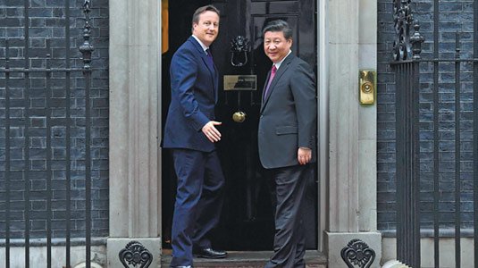 10月21日,國家主席習近平和英國首相卡梅倫共同出席在倫敦金融城舉行的中英工商峰會并致辭。新華社記者 張鐸 攝  10月21日,國家主席習近平和英國首相卡梅倫共同出席在倫敦金融城舉行的中英工商峰會并致辭。
