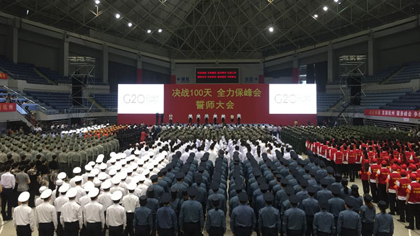 5月27日上午8點半,杭州G20峰會倒計時100天誓師大會在杭州黃龍體育館舉行,來自駐杭部隊、武警官兵、公安干警、志愿者、醫(yī)護人員、城管執(zhí)法、平安巡邏隊以及賓館服務(wù)的近5000名代表參加了誓師。
