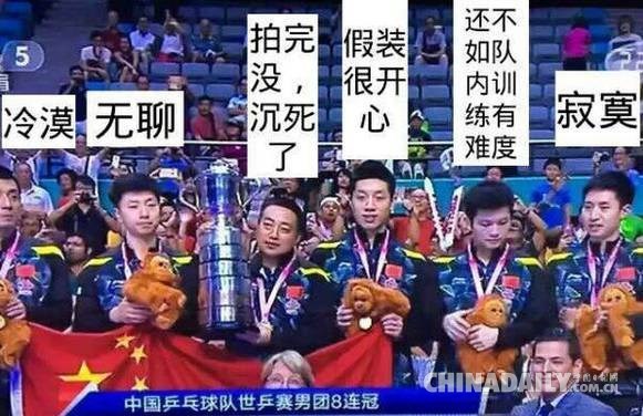除了賽場上霸氣外露,乒乓球魔王團還盛產表情包,新晉“國民老公”張繼科領銜的乒乓球隊“冷漠臉”也走紅網絡。