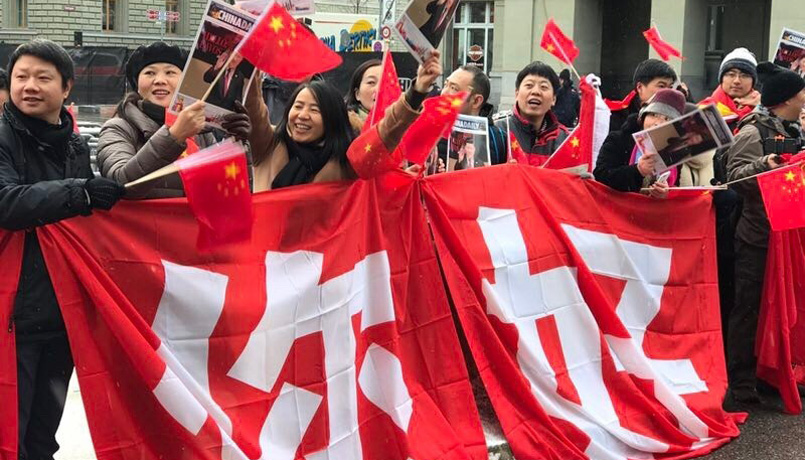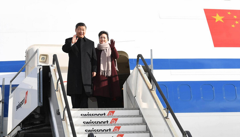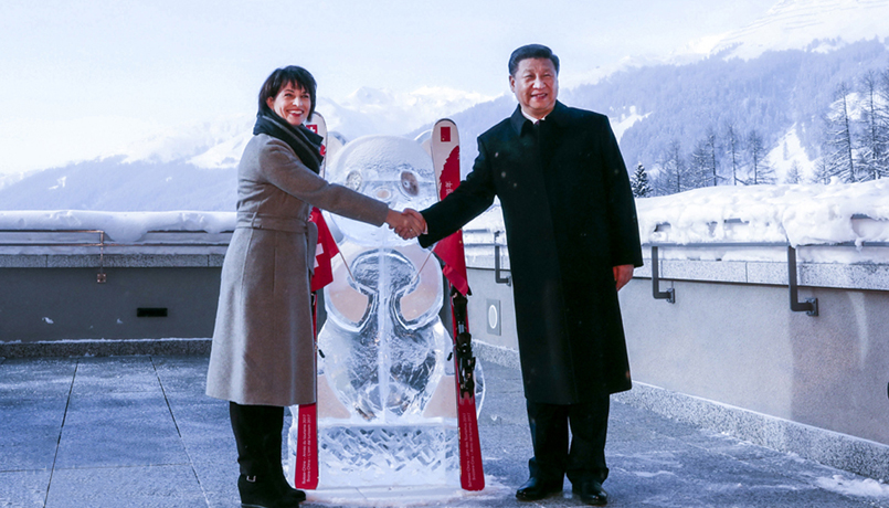 1月17日,國(guó)家主席習(xí)近平同瑞士聯(lián)邦主席洛伊特哈德在達(dá)沃斯共同啟動(dòng)中瑞旅游年。兩國(guó)元首在熊貓冰雕像和印有中瑞兩國(guó)國(guó)旗及“中瑞旅游年”字樣的滑雪板旁合影留念。