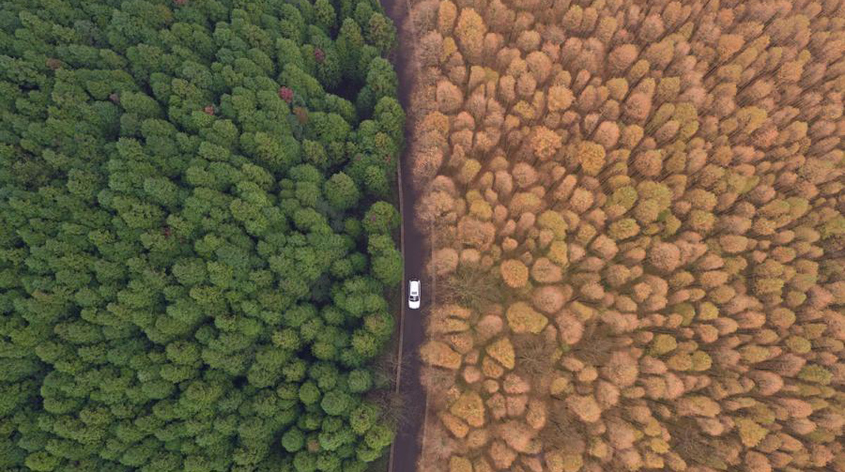 新華社記者岳月偉 攝  俯瞰整治完成的浙江省安吉縣西苕溪荊灣段,西苕溪水系最后匯入太湖(2016年11月3日攝)。新華社記者 徐速繪 攝  俯瞰西藏林芝境內的拉林高等級公路(2016年4月4日攝)。