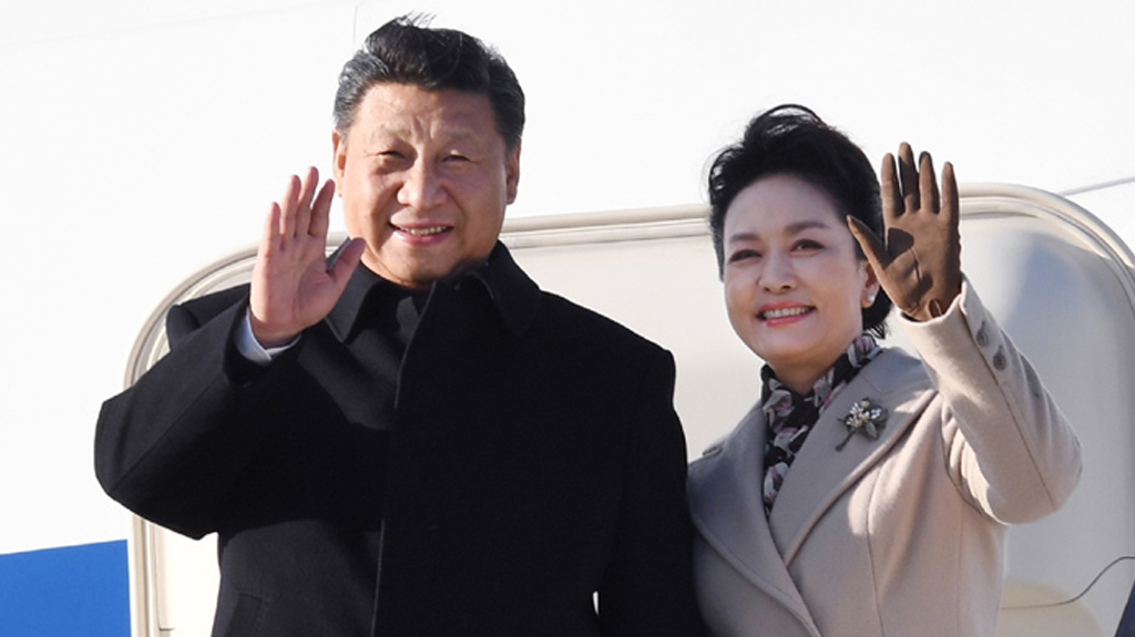 4月4日,國家主席習近平乘專機抵達赫爾辛基,開始對芬蘭共和國進行國事訪問。這是習近平和夫人彭麗媛步出艙門。這是芬蘭政府代表、農業與環境部長蒂利凱寧等在舷梯旁熱情迎接習近平和夫人彭麗媛。