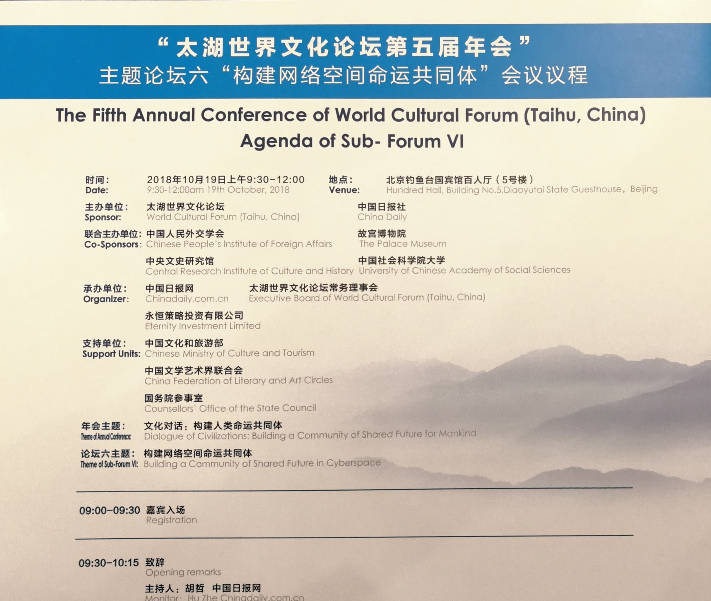 10月19日上午9:30,太湖世界文化論壇第五屆年會主題論壇六“構建網絡空間命運共同體”即將開始。