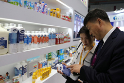 2018年11月7日,人們參觀進博會新西蘭恒天然展臺。中國國際進口博覽會11月5日在上海開幕,多家海外乳制品企業(yè)參展。