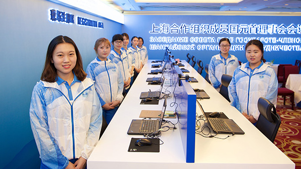 6月4日,注冊中心的志愿者們整裝迎賓。上海合作組織成員國元首理事會會議注冊中心自6月1日在青島啟用。隨著峰會臨近,注冊中心的61位志愿者以熱情周到的服務接待前來注冊的各國嘉賓。