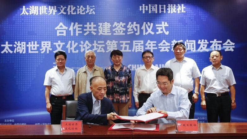 2018年8月28日,太湖世界文化論壇與中國日報社合作共建簽約儀式暨第五屆年會新聞發(fā)布會在北京舉行。