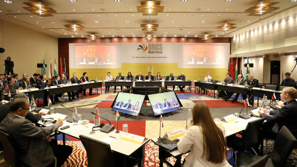 這是7月18日在南非開普敦拍攝的第三屆金磚國家媒體高端論壇。屆金磚國家媒體高端論壇18日在南非開普敦開幕,來自金磚五國的媒體機構(gòu)代表圍繞“在構(gòu)建包容、公正的全球秩序中加強媒體合作”這一主題展開系列研討,意在深化拓展金磚國家媒體友好交流與務(wù)實合作。