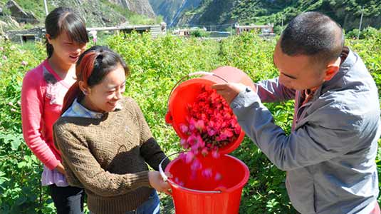 七月的小金,晴空湛藍。據了解,近年來,小金縣改扶貧“輸血”為“造血”,從根本上幫助群眾脫貧致富,帶動當地老百姓持續增收。在清多香玫瑰花企業里,工人們正在擇花,而冒水村貧困戶周興燕就是其中一個。