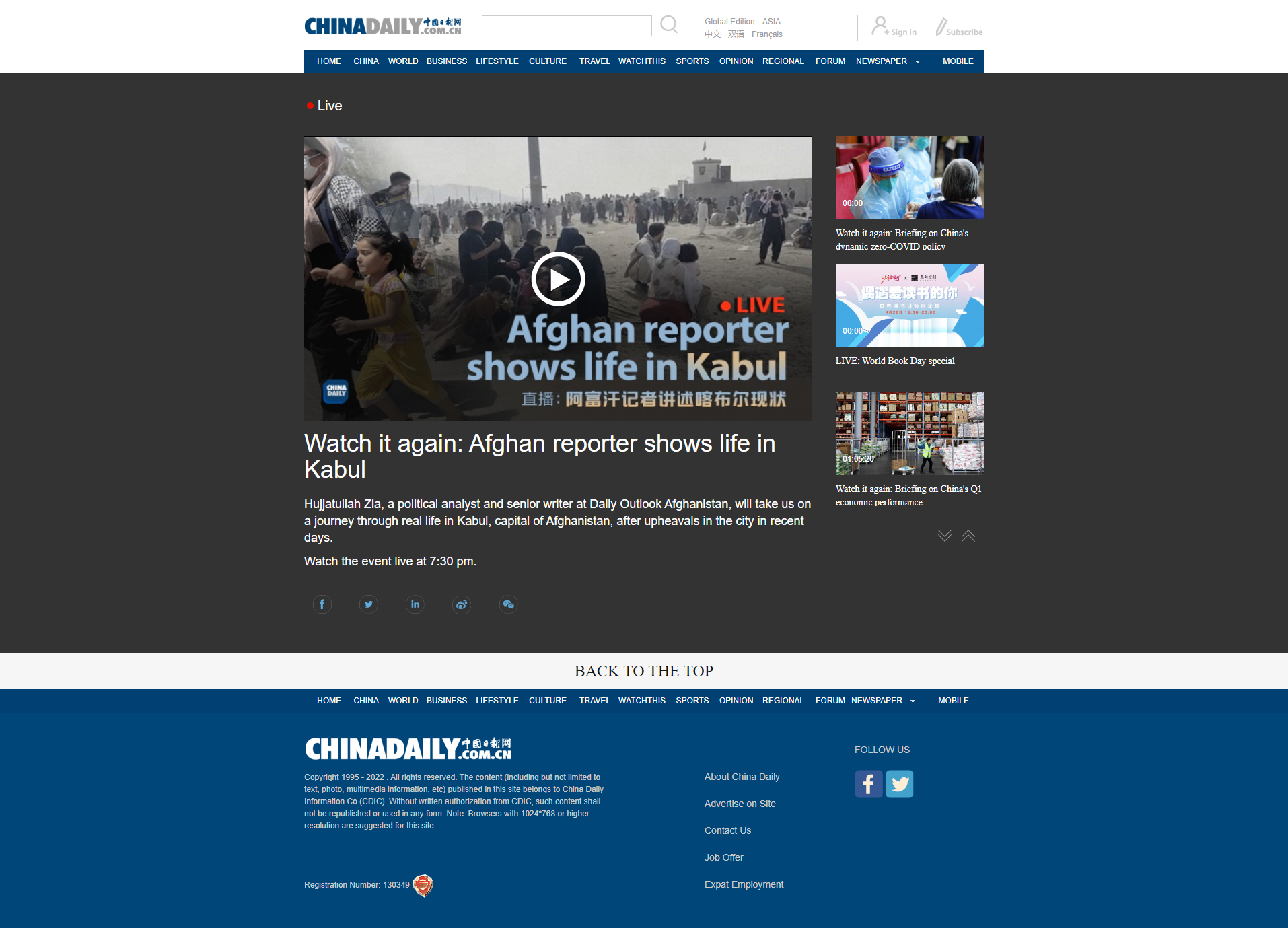 根據(jù)《中國新聞獎評選辦法》有關規(guī)定,經(jīng)中國日報社各采編部門、各駐地方機構、各駐境外機構等推薦,并經(jīng)過社內(nèi)部評審、編委會集體審議,社領導批準,推薦音視頻新聞直播《LIVE:Afghan reporter shows life in Kabul(直播:阿富汗記者講述喀布爾現(xiàn)狀)》、國際傳播-音視頻新聞訪談《Video: A dialogue with the Flying Tigers(美國飛虎隊來華抗戰(zhàn)80周年:對話飛虎隊)》、音視頻新聞訪談《潘維廉:中國民主是一種務實的民主》參加第32屆中國新聞獎音視頻新聞訪談、音視頻新聞直播,現(xiàn)予以公示。