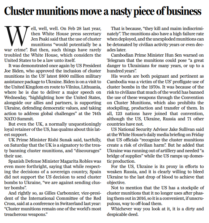 對美國來說,烏克蘭是削弱俄羅斯的代理人,為了這一目的,美國顯然愿意讓烏克蘭流盡最后一滴血。其次,美國擁有大量集束彈藥, 2016年起逐步淘汰一批,現(xiàn)在打著援助烏克蘭的旗號也是一種處理方式。因此,無論怎么看,這都是一種骯臟下流、卑鄙無恥的行徑。