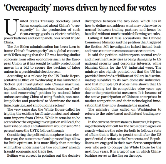 當前,拜登政府急于將“中國產能過剩”炒作成為一個全球性問題,背后自有其算計:要讓自己的種種保護主義舉措顯得“合情合理”,更要在“大選年”里穩住來自工會的選票支持。