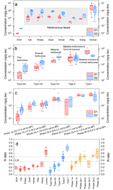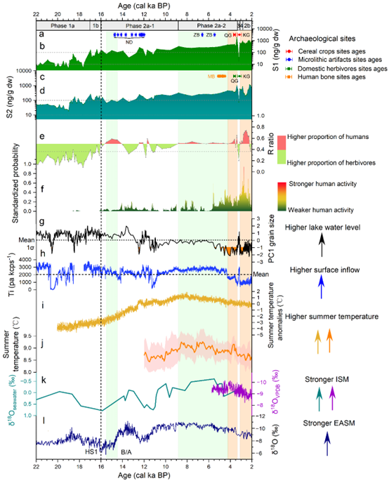 該文章的第一作者,中國(guó)科學(xué)院青藏高原研究所李存林博士表示,該研究選擇了指示人類活動(dòng)和動(dòng)物類群的糞便甾醇指標(biāo),通過(guò)確定主要來(lái)源于人類等雜食性動(dòng)物的糞便S1值(糞甾烷醇+表糞甾烷醇)、主要來(lái)源于牛、羊等食草動(dòng)物的糞便的S2值(5β-乙基糞甾烷醇+5β-乙基表糞甾烷醇)和用于區(qū)分人類和食草動(dòng)物糞便輸入相對(duì)貢獻(xiàn)的R值 [S1 / (S1 + S2)],發(fā)現(xiàn)當(dāng)沉積物樣品中的R值大于0.5時(shí),可以確認(rèn)有人類糞便輸入,S1和S2濃度則分別反映了人類與食草動(dòng)物種群規(guī)模的相對(duì)變化(圖1)。這種基于現(xiàn)代過(guò)程的校準(zhǔn),極大地增強(qiáng)了史前人類活動(dòng)重建結(jié)果的可靠性。該研究還在同一時(shí)間軸上比較了重建的人類活動(dòng)歷史(S1, S2, R值)與環(huán)境變化歷史(湖泊水位、地表徑流)以及區(qū)域溫度和季風(fēng)記錄,可以清晰地識(shí)別出人類活動(dòng)與環(huán)境變化的關(guān)系(圖2)。