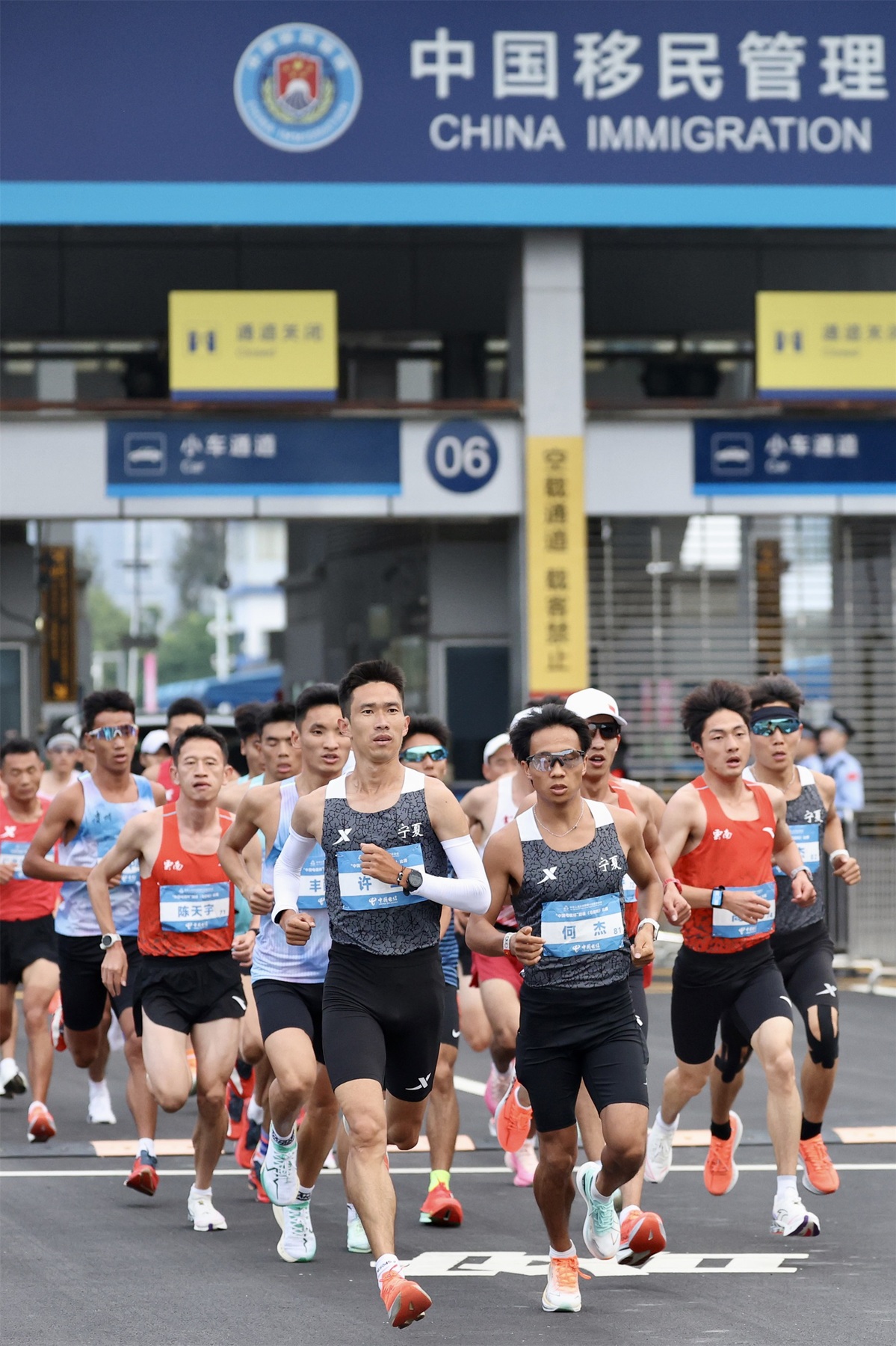 在第十五屆全國運動會田徑項目男子馬拉松比賽中,參賽選手經過深圳灣口岸。中國日報記者 魏曉昊 攝