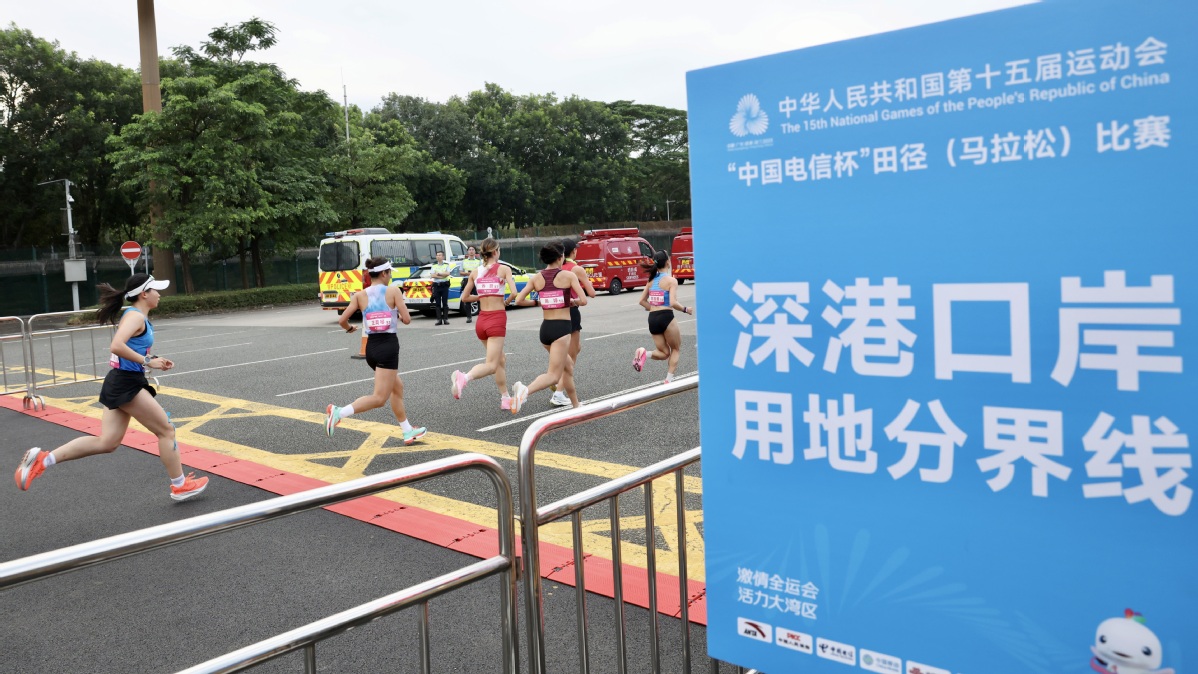 在第十五屆全國運動會田徑項目女子馬拉松比賽中,參賽選手經過深圳灣口岸。中國日報記者 魏曉昊 攝