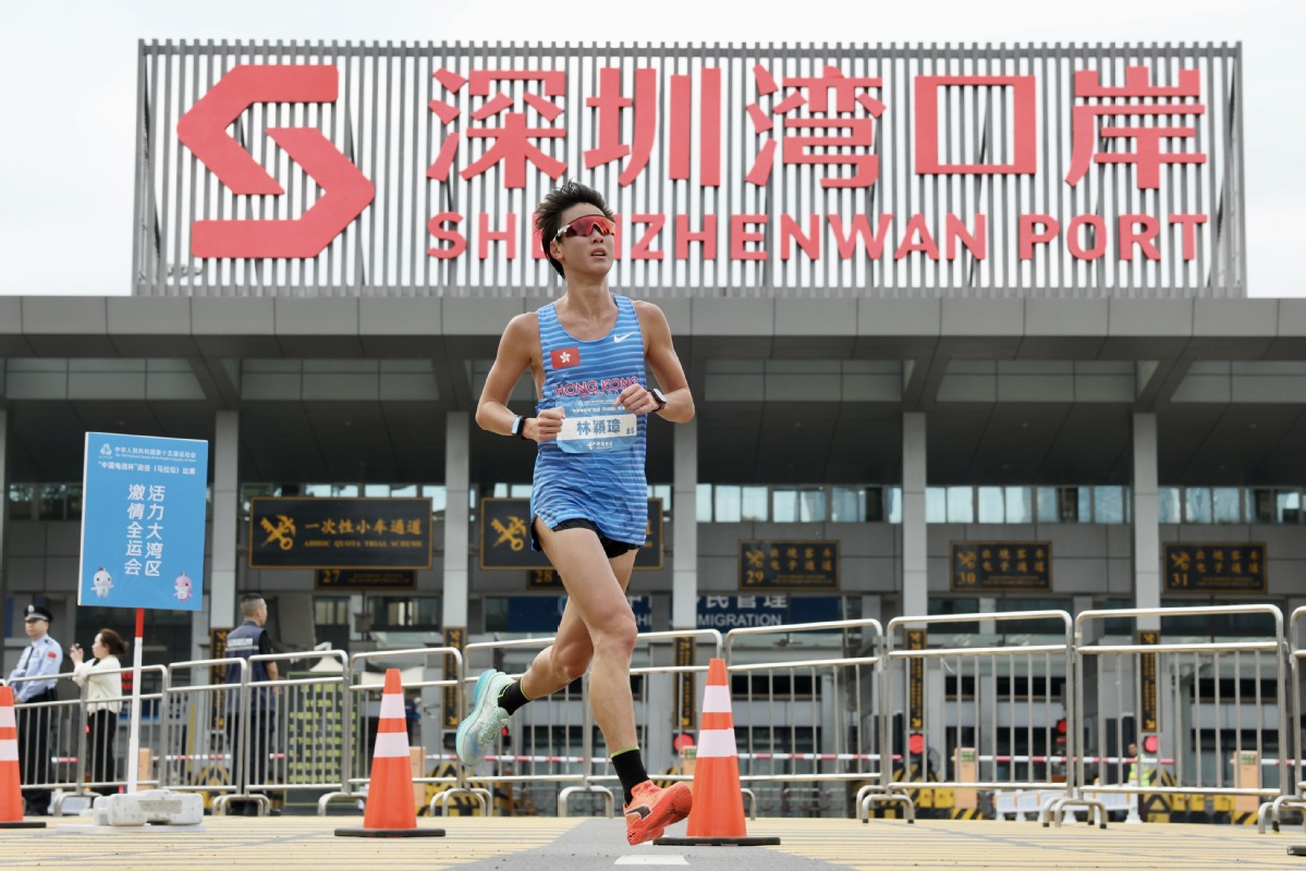 在第十五屆全國運動會田徑項目男子馬拉松比賽中,香港隊選手林穎璋經過深圳灣口岸。中國日報記者 魏曉昊 攝
