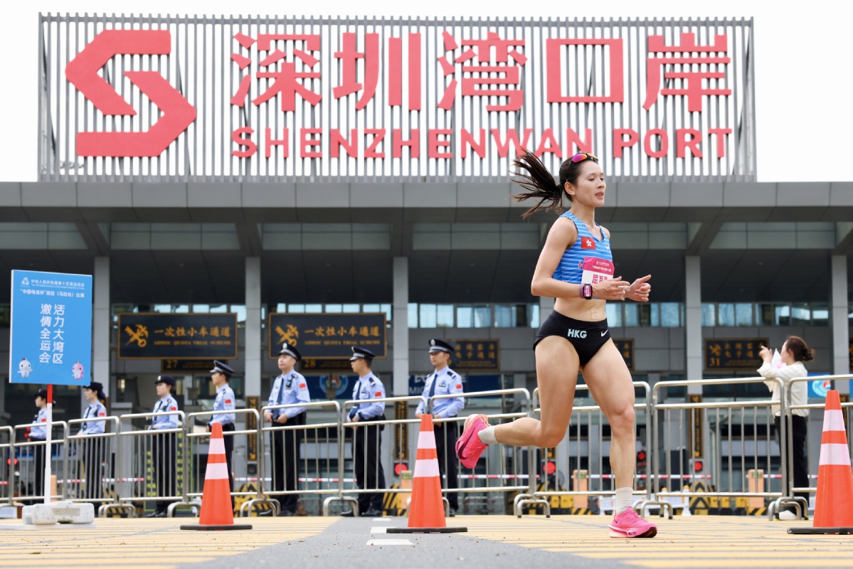 在第十五屆全國運動會田徑項目女子馬拉松比賽中,香港隊選手屈旨盈經過深圳灣口岸。中國日報記者 魏曉昊 攝