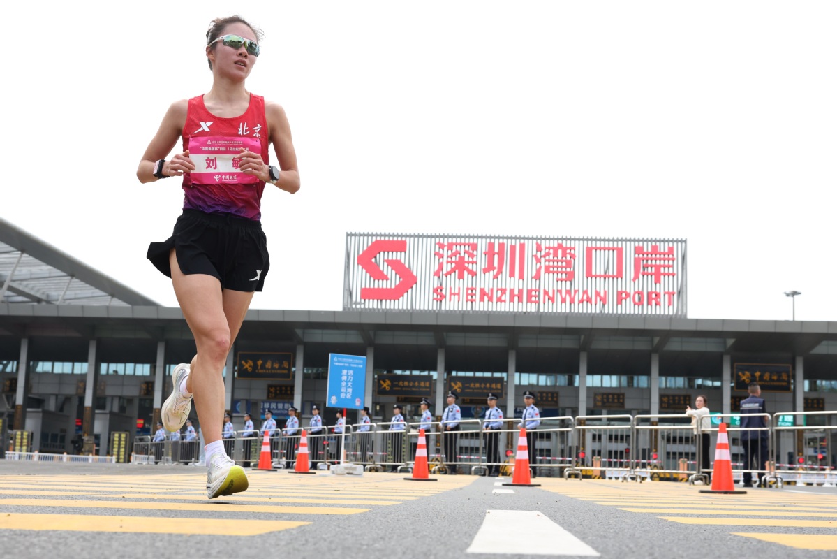 在第十五屆全國運動會田徑項目女子馬拉松比賽中,北京隊選手劉敏經過深圳灣口岸。中國日報記者 魏曉昊 攝