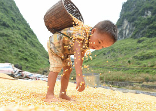 在廣西大化板升鄉弄勇村,7歲的藍桂景在幫忙家里晾曬玉米,他的家剛剛從山弄里搬到公路邊(8月7日攝)。新華社記者 黃孝邦 攝  在廣西大化七百弄鄉弄良村弄丘屯,讀初一的藍寶石在玉米地間騎著山地車玩耍(8月10日攝)。