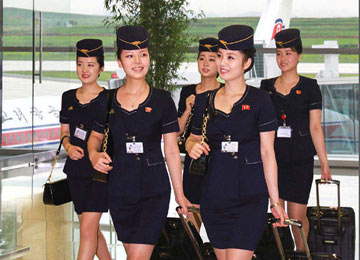 封面人物是朝鮮唯一一家國際航空公司——高麗航空的5名空姐。這些空姐身著2013年更換的新制服,胸前帶有朝鮮前領(lǐng)導(dǎo)人金日成和金正日徽章。