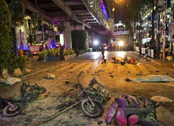 這是8月17日在泰國首都曼谷拍攝的爆炸現場。泰國首都曼谷市中心著名景點四面佛附近17日晚發生爆炸,泰國警方初步認定爆炸物為烈性TNT炸藥,首次爆炸的爆炸物為約200磅TNT當量,威力相當大。警方在爆炸點附近成功拆除疑似兩處引爆裝置。