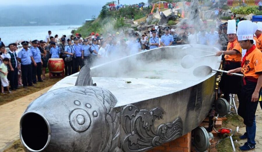 8月20日,在湖南省資興市東江湖畔,經扛旗世界紀錄的工作人員現場鑒定,長11米、寬2米、深0.5米的船形魚鍋被命名為“天下第一魚鍋”,成功挑戰扛旗世界之最紀錄。當日,2015年東江湖魚王節舉行,近萬名游客齊聚東江湖畔,共同見證長2.15米、重205斤的“東江湖魚王”捕撈出水的震撼場面,并現場品嘗鮮美的“天下第一船形魚鍋湯”。