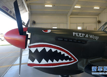 這是在美國路易斯安那州門羅市的陳納德航空軍事博物館拍攝的飛虎隊使用的P-40戰斗機。新華社記者 殷博古 攝   在美國路易斯安那州門羅市的陳納德航空軍事博物館,飛虎隊老兵杰·溫雅德站在陳納德的蠟像前。