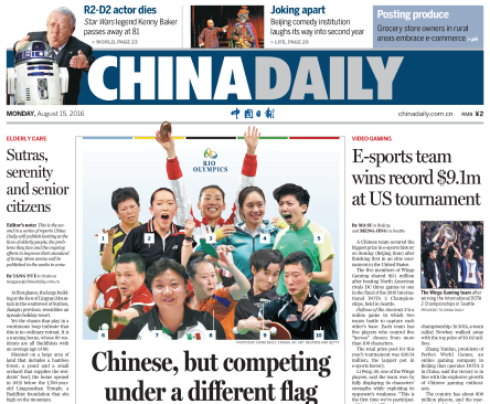 8月15日中國(guó)日?qǐng)?bào)推薦:代表外國(guó)出戰(zhàn)的中國(guó)運(yùn)動(dòng)員