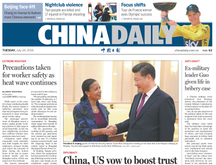 7月26日中國日報推薦:習近平會見賴斯 中美要著力增進互信