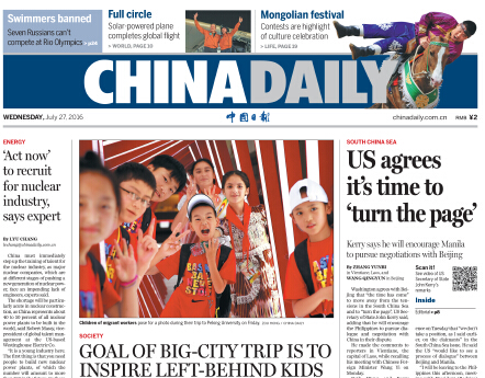 7月27日中國日報推薦:美國務卿:南海局勢應翻篇 支持中菲對話談判