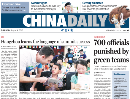 8月4日中國日報推薦:習近平將在G20工商峰會作主旨演講