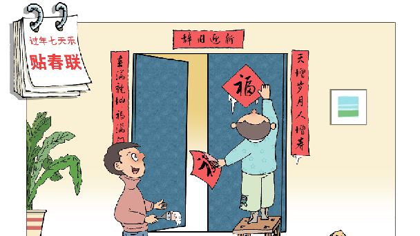 過(guò)年七天樂(lè)——貼春聯(lián)。每逢春節(jié),家家戶戶都在門上貼春聯(lián)和福字,辭舊迎新。