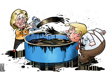 美國(guó)共和黨總統(tǒng)候選人特朗普和民主黨總統(tǒng)候選人希拉里抓住對(duì)方的小辮子,互相攻擊。