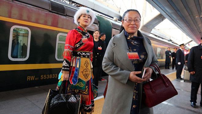 3月2日,來自黑龍江省的全國人大代表乘坐Z16次列車抵達北京站。這是首批抵京參加十三屆全國人大一次會議的京外代表。