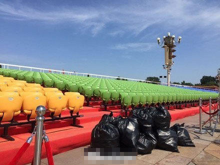 閱兵結束后觀禮臺干凈整潔 垃圾都收在塑料袋中