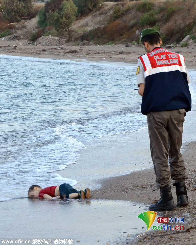 當(dāng)?shù)貢r(shí)間2015年9月2日,土耳其博德魯姆,土耳其憲兵站在被沖上海灘的難民兒童尸體旁。當(dāng)?shù)貢r(shí)間2015年9月3日,土耳其安卡拉,民眾在聯(lián)合國辦事處外靜坐示威,抗議敘利亞男童偷渡希臘遭遇沉船,最后浮尸土耳其海灘。