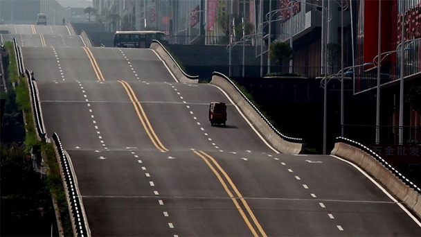 9月7日,重慶巴南界石現波浪形公路,路過的司機稱有騰空的感覺很刺激。因為旁邊的商業樓共有四層,為了方便每一層樓的商家能夠將車開到門口,所以在當初規劃的時候就設計了這段波浪形狀的公路,方便經營戶。