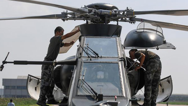 9月9日,在天津中航直升機產業基地,“風雷”飛行表演隊直升機準備降落。