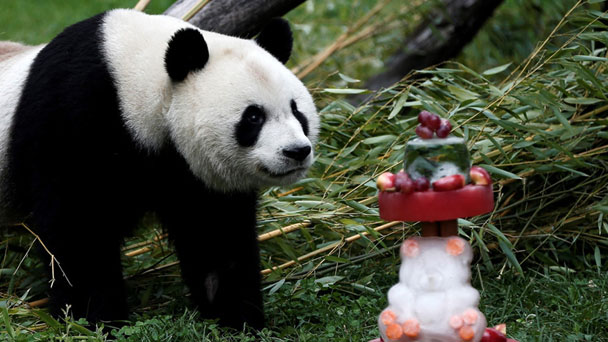 當地時間9月9日,西班牙馬德里公園為旅居雌性大熊貓竹莉娜(Chulina)慶祝第一個生日。動物園工作人員制作了巨大的竹子“生日蛋糕”為竹莉娜慶生。
