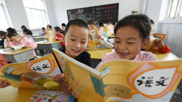 8月30日,上海市金山區(qū)海棠小學一年級新生展示領到的語文部編教材。中小學全新“部編教材”啟用,租房也能上名校,一入小學就開始上科學課……今年秋季開學,系列“新政”新鮮出爐,牽動千家萬戶。