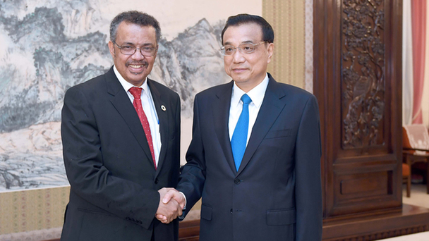 8月18日,國務院總理李克強在北京中南海紫光閣會見世界衛生組織新任總干事譚德塞。新華社記者 張鐸 攝