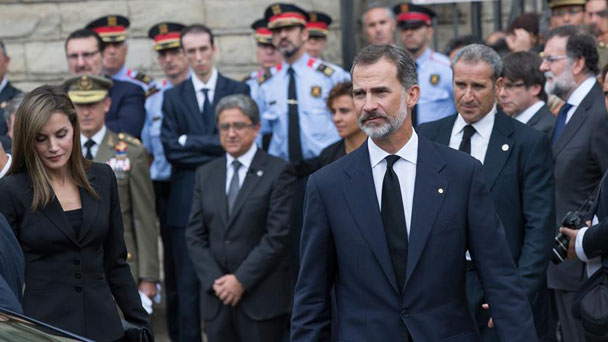8月20日,西班牙國王費利佩六世(前左)和王后萊蒂齊婭(前右)抵達巴塞羅那地標性建筑圣家族大教堂,參加為恐襲死難者舉行的追思活動。