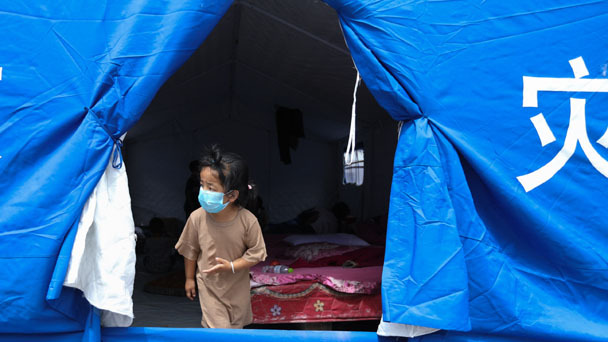8月11日,在九寨溝景區內荷葉寨受災群眾安置點,一位老人帶著孩子走出帳篷。目前,大批救災物資已抵達九寨溝地震災區,災區群眾也陸續領到帳篷,開始了帳篷里的“新”生活。
