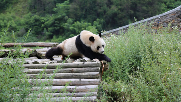 8月11日,一只成年大熊貓在臥龍中國大熊貓保護研究中心神樹坪基地的樹上玩耍。當日,記者從臥龍國家級自然保護區管理局了解到,8月8日發生的九寨溝7級地震暫未對保護區內的大熊貓造成影響。