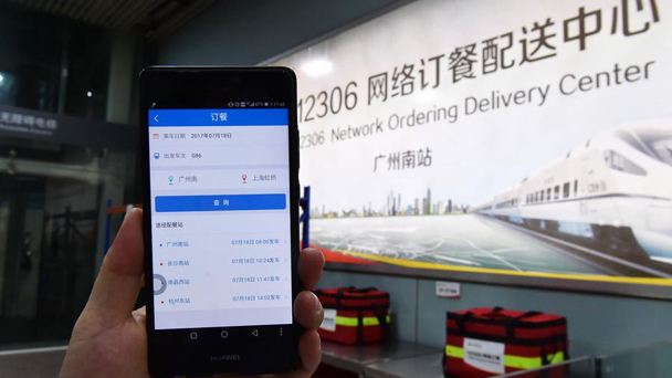 7月17日,鐵路部門工作人員在演示使用手機訂餐。新華社記者 梁旭 攝  7月17日,在廣州南站,商家將外賣送至網絡訂餐配送中心,由工作人員統一送上列車。新華社記者 梁旭 攝  7月17日,在廣州南站網絡訂餐配送中心,工作人員準備將外賣送上列車。