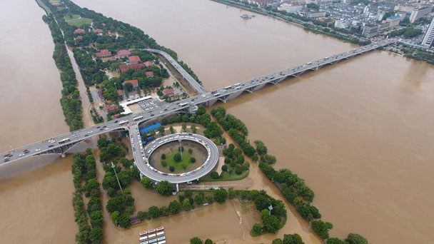 7月4日航拍的洪峰過境時(shí)長沙橘子洲大橋附近湘江水域,沿江兩岸大堤是長沙防洪的“生命線”。據(jù)長沙市水文站監(jiān)測(cè)數(shù)據(jù)顯示,截至7月4日下午17時(shí),長沙湘江水位達(dá)38.95米,超出警戒水位2.95米,防汛形勢(shì)依然嚴(yán)峻。