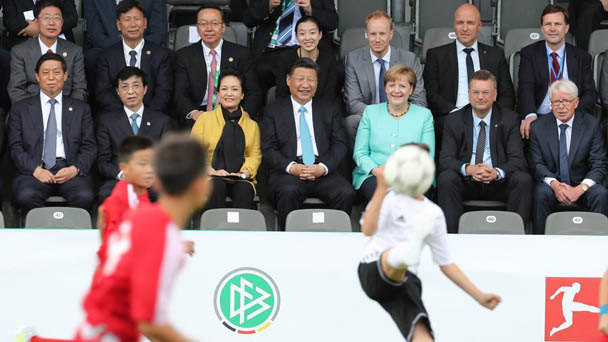 7月5日,國家主席習(xí)近平在柏林同德國總理默克爾共同觀看中德青少年足球友誼賽。這是習(xí)近平和夫人彭麗媛同默克爾在看臺(tái)上。