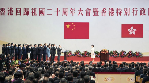 7月1日上午,慶祝香港回歸祖國20周年大會暨香港特別行政區第五屆政府就職典禮在香港會展中心隆重舉行。新華社記者 李濤 攝  7月1日上午,慶祝香港回歸祖國20周年大會暨香港特別行政區第五屆政府就職典禮在香港會展中心隆重舉行。