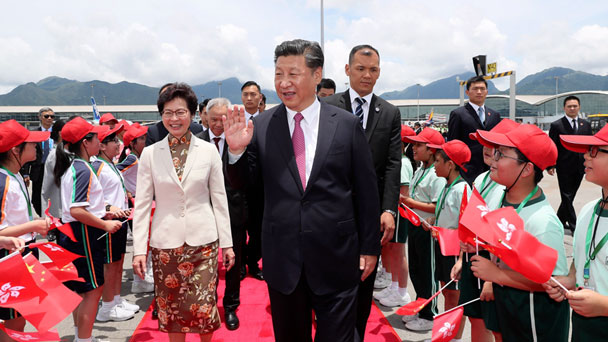 7月1日中午,中共中央總書記、國家主席、中央軍委主席習近平圓滿結束在香港的各項活動,從香港乘專機返回北京。這是在歡送儀式上,習近平向歡送隊伍揮手道別。新華社記者 蘭紅光 攝